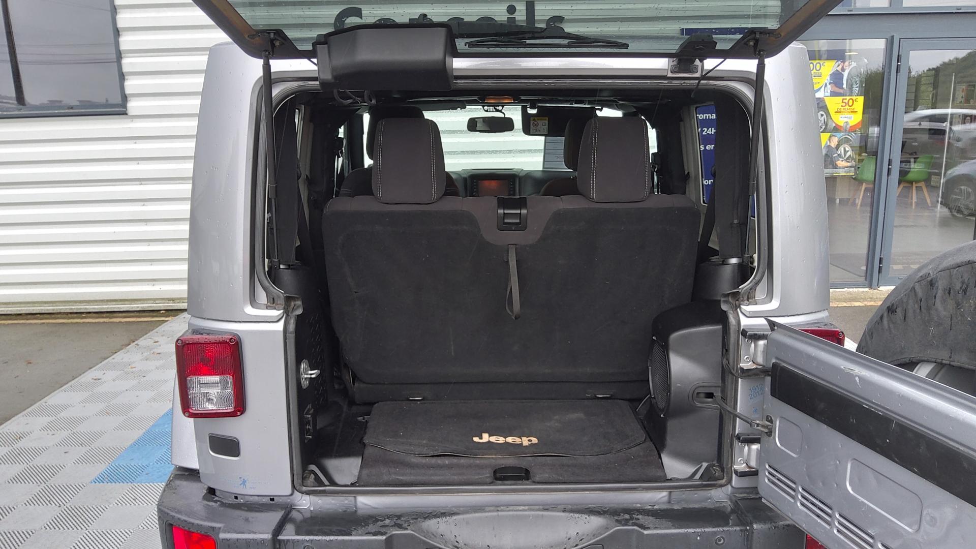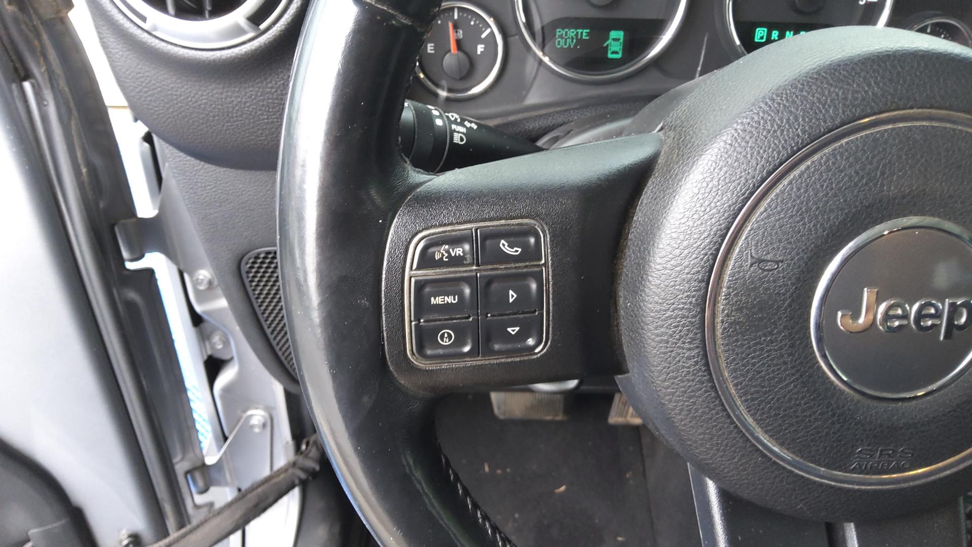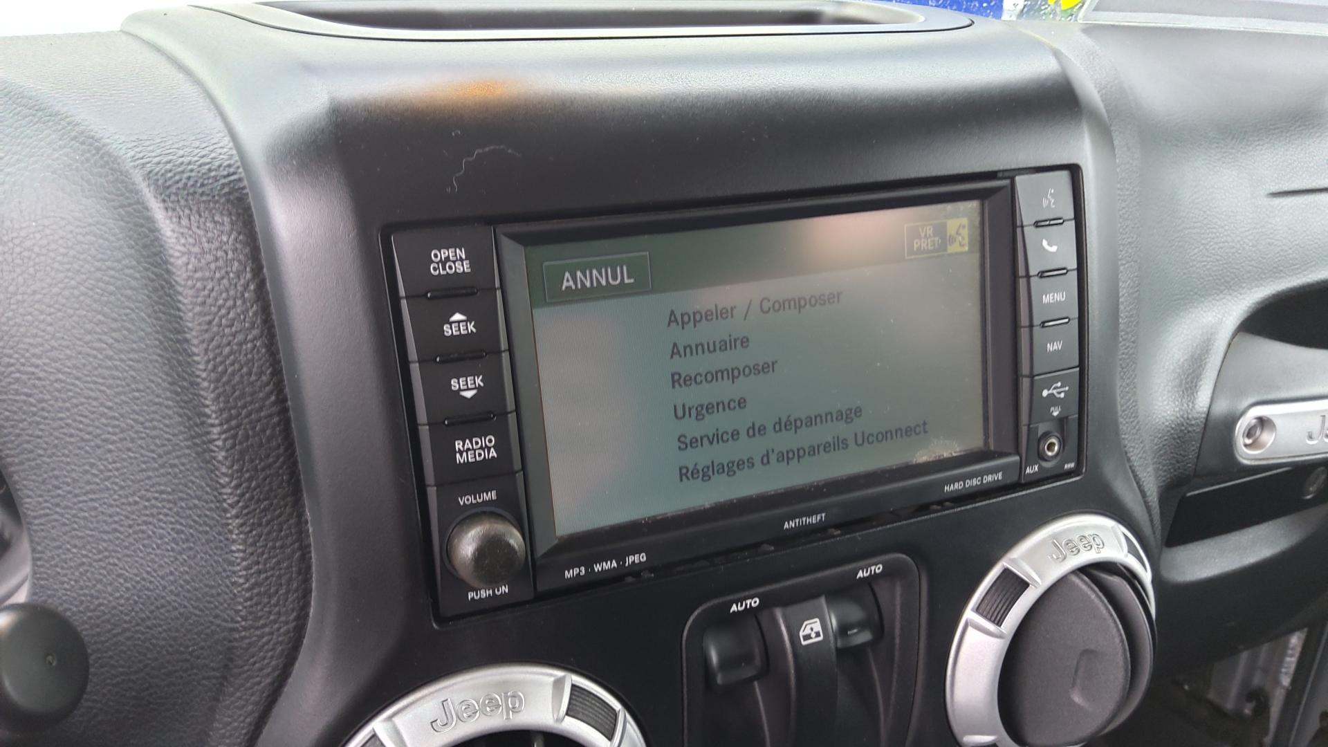 ABS - Système antiblocage des roues avec gestion différenciée en fonction de la nature du sol (gravier, herbe, goudron…)Accoudoir central avant, coulissant avec bac de rangementAirbags frontaux (conducteur et passager) nouvelle génération à déploiement variableAirbags latéraux additionnels (dans les sièges conducteur et passager)Allumage automatique des projecteursBanquette arrière inclinable à 12°Calandre Jeep couleur carrosserieCasier de rangement dans le coffreCeintures de sécurité arrière 3 pointsCeintures de sécurité avant réglables en hauteur avec prétensionneur et limiteur d'effortClimatisation automatiqueCrochets pour porte-manteauxEcrous antivolÉlargisseurs d'ailes couleur carrosserieESP - Système de régulation du comportement dynamiqueFeux antibrouillard arrièreHard-Top modulaire Freedom Top couleur carrosserieInserts d'habitacle clairJantes alliage 18"Kit fumeurMarchepiedsOrdinateur de bordPare-brise rabattablePare-chocs noirsPare-soleil coulissantsPlaque de protection en acier de la boîte de transfertPlaque de protection en acier du réservoirPrises d'alimentation électrique 12 V (console centrale et accoudoir central)Projecteurs antibrouillardRégulateur de vitesse avec commandes au volantRépartiteur électronique de freinage REFRétroviseur intérieur photochromatique avec liseuse de carteRétroviseurs avec réglage électrique et fonction dégivrageRoue de secours avec housse en vinyle noireRoue de secours taille réelleSellerie en tissu PremiumSiège conducteur réglable en hauteurSièges avant Easy AccessSimulateur de différentiel électronique par action sur les freinsSystème anti-démarrage Sentry KeySystème antipatinage 4 roues par action sur les freinsSystème audio Premium par AlpineSystème de contrôle de la descenteSystème de contrôle de la pression des pneus (avertit en cas de perte de pression d'un pneu)Système de fixation pour siège enfant ISOFIXSystème de navigation GPS Europe de l'Ouest à affichage 2D/3D et information traficSystème de téléphonie mains-libres Uconnect avec reconnaissance vocaleSystème multimédia : écran tactile 16,5 cm, lecteur CD/DVD/MP3, autoradio et disque dur de 30 GoVerrouillage automatique des portes au dessus de 30 km/hVitres arrières surteintéesVitres électriquesVolant Jeep à trois branches gainé de cuirVolant multifonctionVolant réglable en hauteur