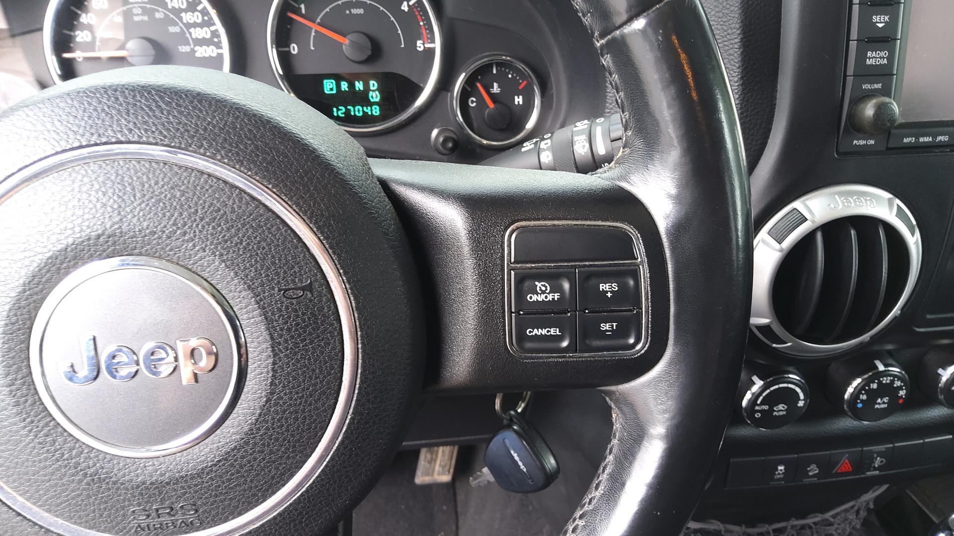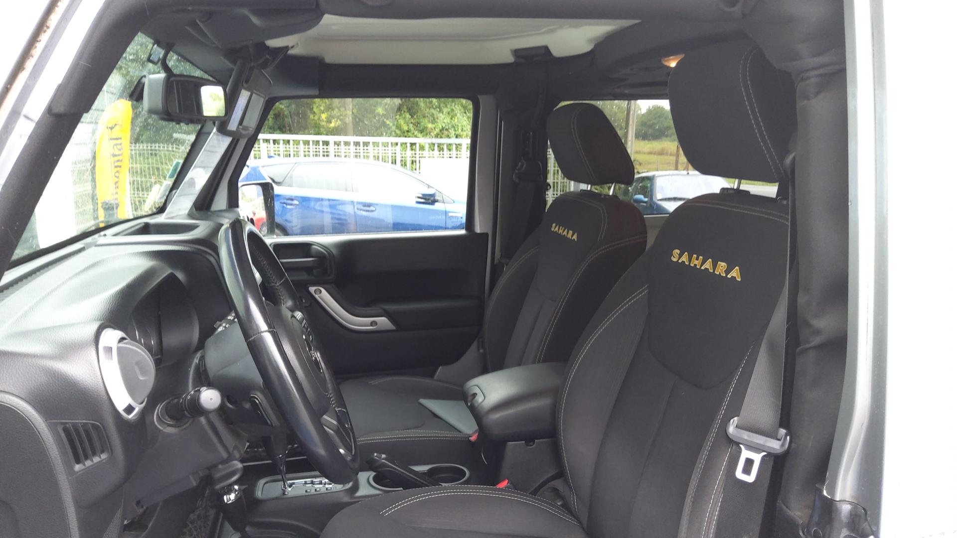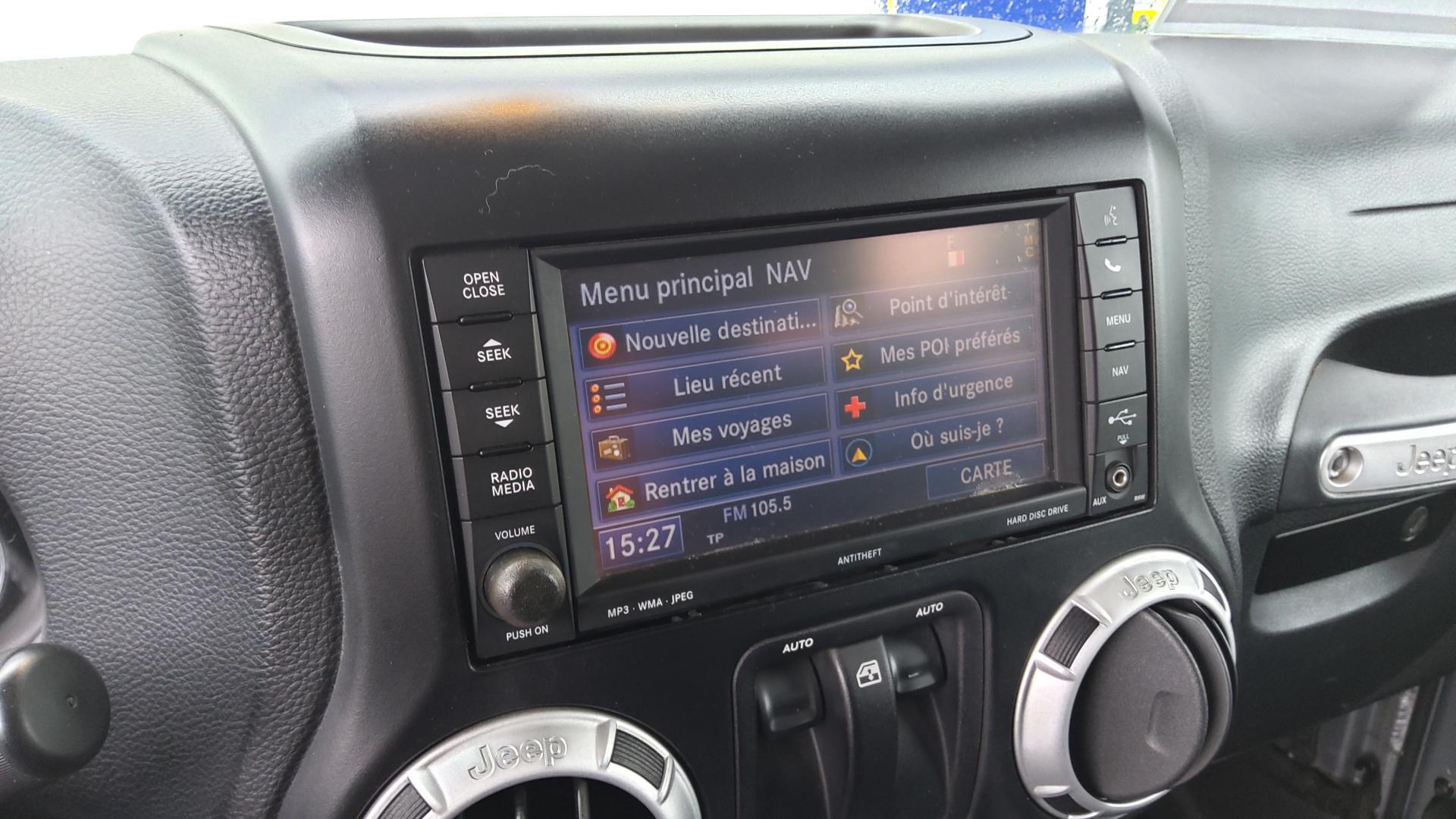 ABS - Système antiblocage des roues avec gestion différenciée en fonction de la nature du sol (gravier, herbe, goudron…)Accoudoir central avant, coulissant avec bac de rangementAirbags frontaux (conducteur et passager) nouvelle génération à déploiement variableAirbags latéraux additionnels (dans les sièges conducteur et passager)Allumage automatique des projecteursBanquette arrière inclinable à 12°Calandre Jeep couleur carrosserieCasier de rangement dans le coffreCeintures de sécurité arrière 3 pointsCeintures de sécurité avant réglables en hauteur avec prétensionneur et limiteur d'effortClimatisation automatiqueCrochets pour porte-manteauxEcrous antivolÉlargisseurs d'ailes couleur carrosserieESP - Système de régulation du comportement dynamiqueFeux antibrouillard arrièreHard-Top modulaire Freedom Top couleur carrosserieInserts d'habitacle clairJantes alliage 18"Kit fumeurMarchepiedsOrdinateur de bordPare-brise rabattablePare-chocs noirsPare-soleil coulissantsPlaque de protection en acier de la boîte de transfertPlaque de protection en acier du réservoirPrises d'alimentation électrique 12 V (console centrale et accoudoir central)Projecteurs antibrouillardRégulateur de vitesse avec commandes au volantRépartiteur électronique de freinage REFRétroviseur intérieur photochromatique avec liseuse de carteRétroviseurs avec réglage électrique et fonction dégivrageRoue de secours avec housse en vinyle noireRoue de secours taille réelleSellerie en tissu PremiumSiège conducteur réglable en hauteurSièges avant Easy AccessSimulateur de différentiel électronique par action sur les freinsSystème anti-démarrage Sentry KeySystème antipatinage 4 roues par action sur les freinsSystème audio Premium par AlpineSystème de contrôle de la descenteSystème de contrôle de la pression des pneus (avertit en cas de perte de pression d'un pneu)Système de fixation pour siège enfant ISOFIXSystème de navigation GPS Europe de l'Ouest à affichage 2D/3D et information traficSystème de téléphonie mains-libres Uconnect avec reconnaissance vocaleSystème multimédia : écran tactile 16,5 cm, lecteur CD/DVD/MP3, autoradio et disque dur de 30 GoVerrouillage automatique des portes au dessus de 30 km/hVitres arrières surteintéesVitres électriquesVolant Jeep à trois branches gainé de cuirVolant multifonctionVolant réglable en hauteur